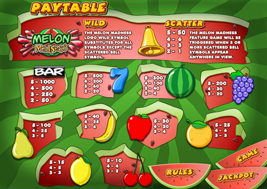 Melon Madness is a five-reel, thirty-line jackpot slot game with a Free Spins feature. When 3 or more scattered Bell symbols appear anywhere in view, the player is required to choose one scattered Bell which reveals the free spin count and multiplier value. The free spins feature cannot be retriggered within free spins.