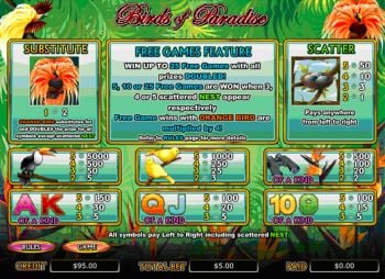 Birds of Paradise Slot is a five-reel, 20-payline video slot game with a 'free games' feature. The Free Games Feature is triggered when 3 or more Scattered Nest appear any where from Left to Right. 3, 4 or 5 Scattered Nest triggers 5, 10 or 25 free games respectively. Additional 1 to 3 free spins are awarded for each scattered Nest symbol that appear anywhere in view during Free Spins. All wins during free games are doubled.