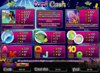 Coral Cash Slot is a five-reel, twenty-line slot game with a 'free game' feature. The feature is triggered when Girl appears anywhere on Reel 1 and Coral appears anywhere on Reel 5.