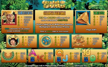 Gold of the Gods is a five-reel, twenty-line slot game with a special Eclipse feature. The Eclipse feature is triggered when three or more Scattered Sceptre appears anywhere. The Gods have obscured the Sun with an Eclipse. Select objects as offerings to the Gods and be favoured with cash prizes, free games and multipliers. Keep selecting until the Sun Symbol is revealed, indicating the Gods are appeased and bring back the light. All cash prizes and free games are multiplied by any revealed multipliers. All cash prizes are multiplied by the total bet. The Eclipse Feature cannot be triggered again during the free games. Free games are played at the same lines and bet of the triggering game.