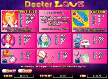 Dr Love es una máquina tragaperras de cinco cilindros y veinte líneas de pago con juego de tiradas gratuitas. El juego de tiradas gratuitas se activa cuando aparecen 3, 4 o 5 símbolos Scatter (Medidor de amor) en cualquier lugar del panel de cilindros.