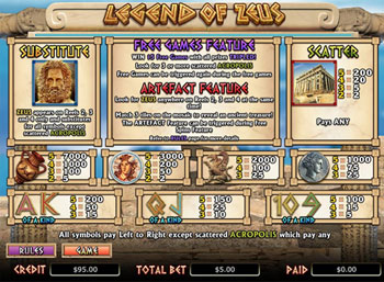 Legend of Zeus es una máquina tragaperras de cinco cilindros y veinte líneas de pago con juego de tiradas gratuitas y juego de bonificación "Artefacto". El juego de tiradas gratuitas se activa cuando aparecen tres o más símbolos Scatter (Acrópolis) en cualquier posición. Se otorgan 15 tiradas gratuitas, durante las cuales los premios se triplican. El juego de tiradas gratuitas se puede volver a activar si aparecen tres o más Acrópolis en cualquier posición. El juego de bonificación "Artefacto" se inicia automáticamente cuando aparece el símbolo de Zeus en cualquier posición y al mismo tiempo en los cilindros dos, tres y cuatro. El juego de bonificación puede activarse mientras se efectúan las tiradas gratuitas.